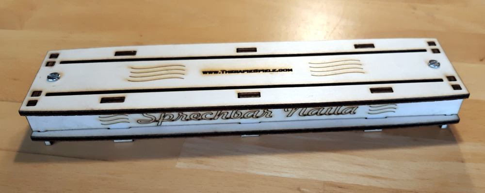 Das Laserschneiden liegt voll im Trend. Wir haben uns ein neues, praktisches Produkt für euch ausgedacht: Den Kartenhalter. Er wird komplett mit dem Lasercutter geschnitten und erlaubt auch einen personalisierten Schriftzug auf der Vorderseite (im Bild: „Sprechbar Naila“).