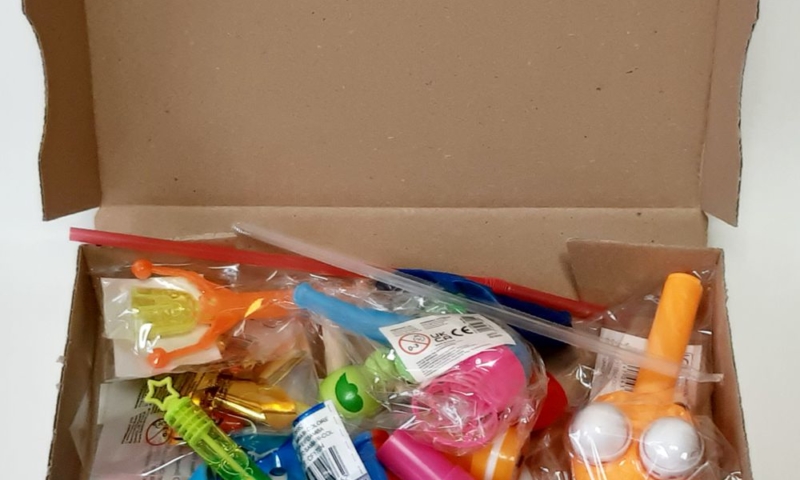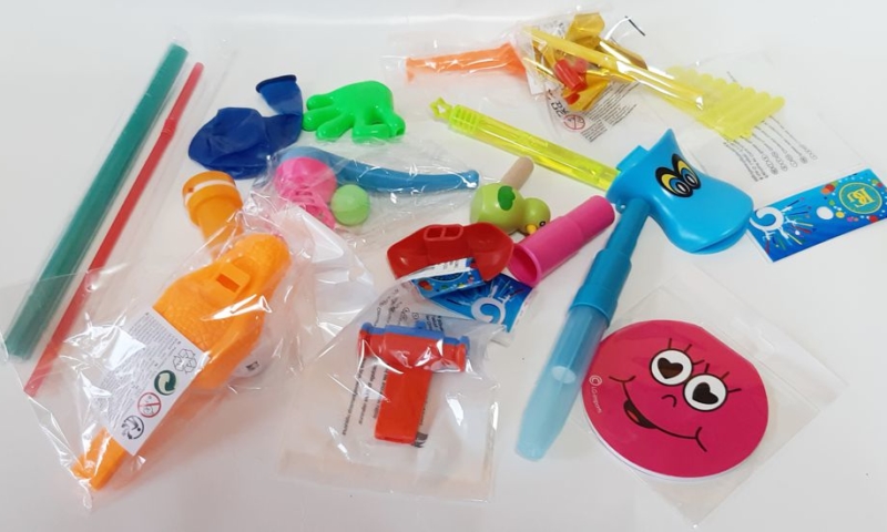 Sie enthält mindestens 14 verschiedene Pustespiele, Pfeifen, Tröten etc. Die Zusammensetzung kann nach Verfügbarkeit variieren – immer enthalten sind ein Blowpen, ein Luftballon, Seifenblasen und drei Strohhalme in verschiedenen Längen und Dicken. Außerdem sind zusätzlich zwei kleine Geschenke enthalten, z.B. Stempel oder Notizblöcke.